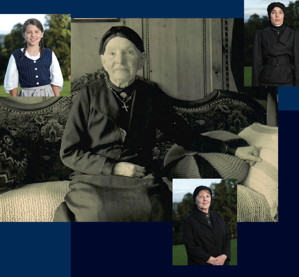 Klara Bischof (Bildmitte), als Kind: Nina Matter (links oben), als junge frau: Rebecca Heierli (rechts oben), als erwachsene: Daniela Breu (rechts unten)